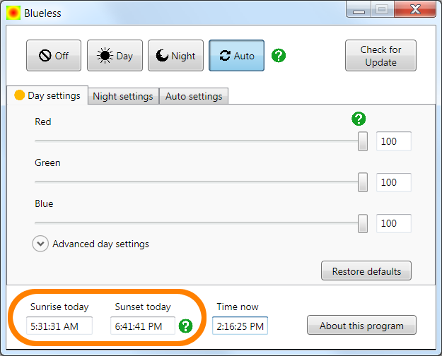 The times of sunrise and sunset at your location are shown in these fields, but only if you have entered Latitude and Longitude on Auto Settings. If Latitude and Longitude are blank, these fields are also blank, because Blueless needs to know your location in order to calculate sunrise and sunset.